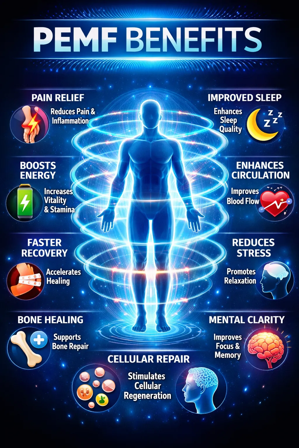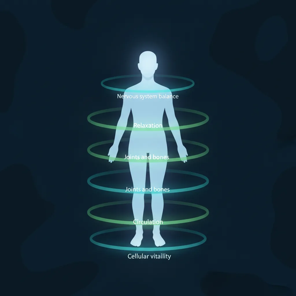 Soft energy rings illuminate the places people often bring PEMF — to nourish cellular aliveness, ease circulation, soothe joints, deepen relaxation, and cradle nervous-system balance.